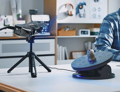 掃描儀通過三腳架支撐放置于桌面,對雙軸轉(zhuǎn)臺上的物體全場藍光高動態(tài)掃描,一鍵實現(xiàn)復(fù)雜形狀物體的可靠點云和彩色重建。