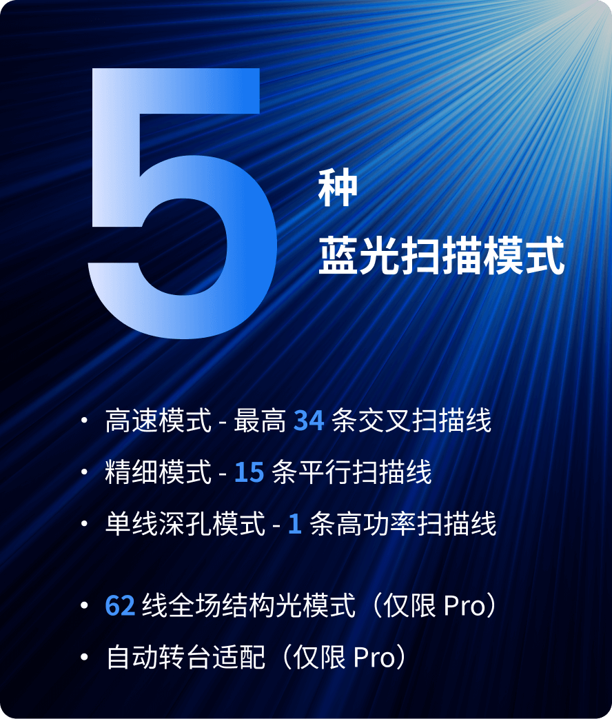激光交叉多線掃描、平行多線精細掃描、單線深孔掃描及全場藍光結(jié)構(gòu)光四種手持掃描模式和一種轉(zhuǎn)臺自動掃描模式。